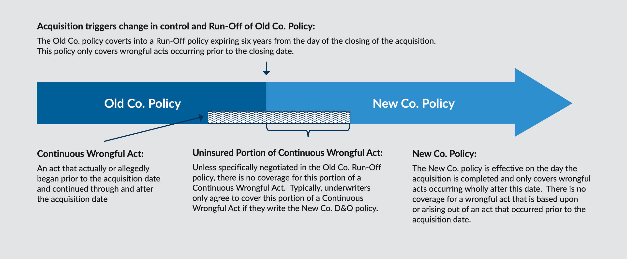 A D&O policy is written on a claims-made basis, which means it responds to claims made during the policy period, regardless of when a wrongful act occurred. If the policy expires or is canceled, no claim that occurs after the extended reporting period ends would be covered under the policy. When a company is sold, due to the nature of a claims-made policy, coverage for wrongful acts occurring after the date of acquisition ceases once the change of control language is triggered. In most cases the change of control provision amends the coverage to only cover claims made after the transaction based on wrongful acts before the transaction. The ability to obtain coverage for claims made for pre-acquisition wrongful acts will cease shortly after the expiration date of the policy. Soon after policy expiration no coverage is available if a claim for a wrongful act occurred before the sale, leaving the outgoing directors and officers exposed.
